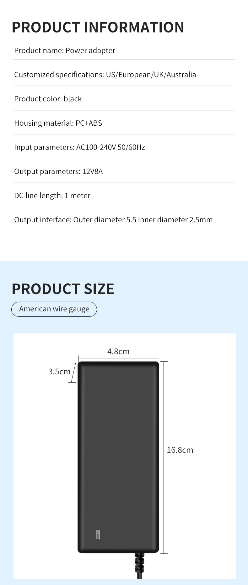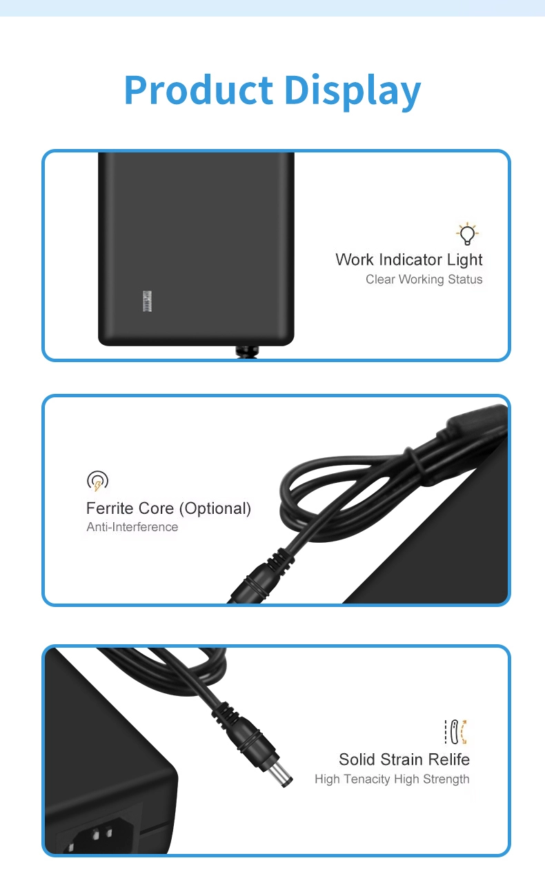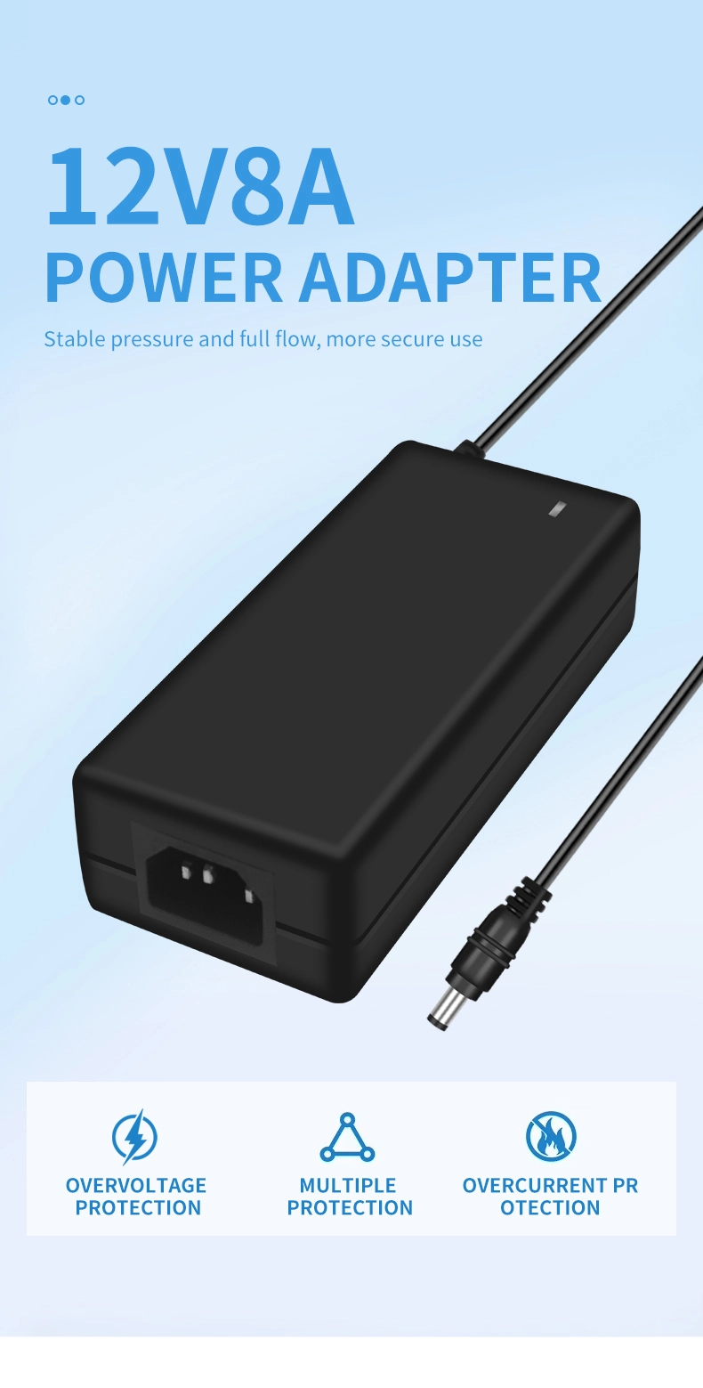 S menovitým výkonom 96 W sa výstupný prúd 96 W napájacieho adaptéra stabilizuje na špičkovej hodnote 8 A a presnosť napätia je kontrolovaná v rozmedzí ± 5 % (napätie naprázdno: 12,1 V; napätie pri plnom zaťažení: 11,8 V). Dokáže uspokojiť súčasné potreby napájania viacerých zariadení (napr. 2 paralelné 48W zariadenia). Výstupný kábel s čistým medeným jadrom zaisťuje pokles napätia ≤ 0,3 V, pričom zachováva netlmený výkon pri prenose vysokého prúdu.