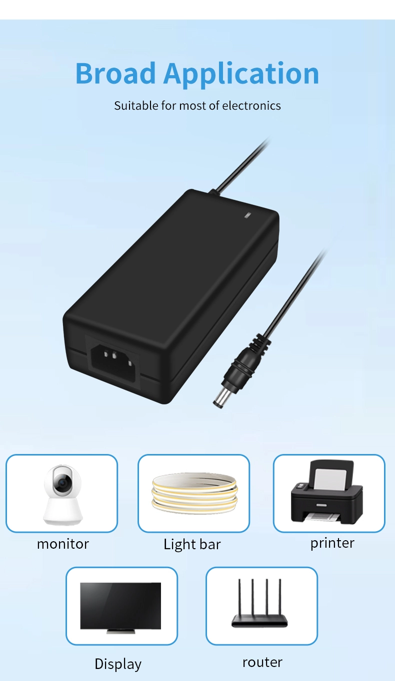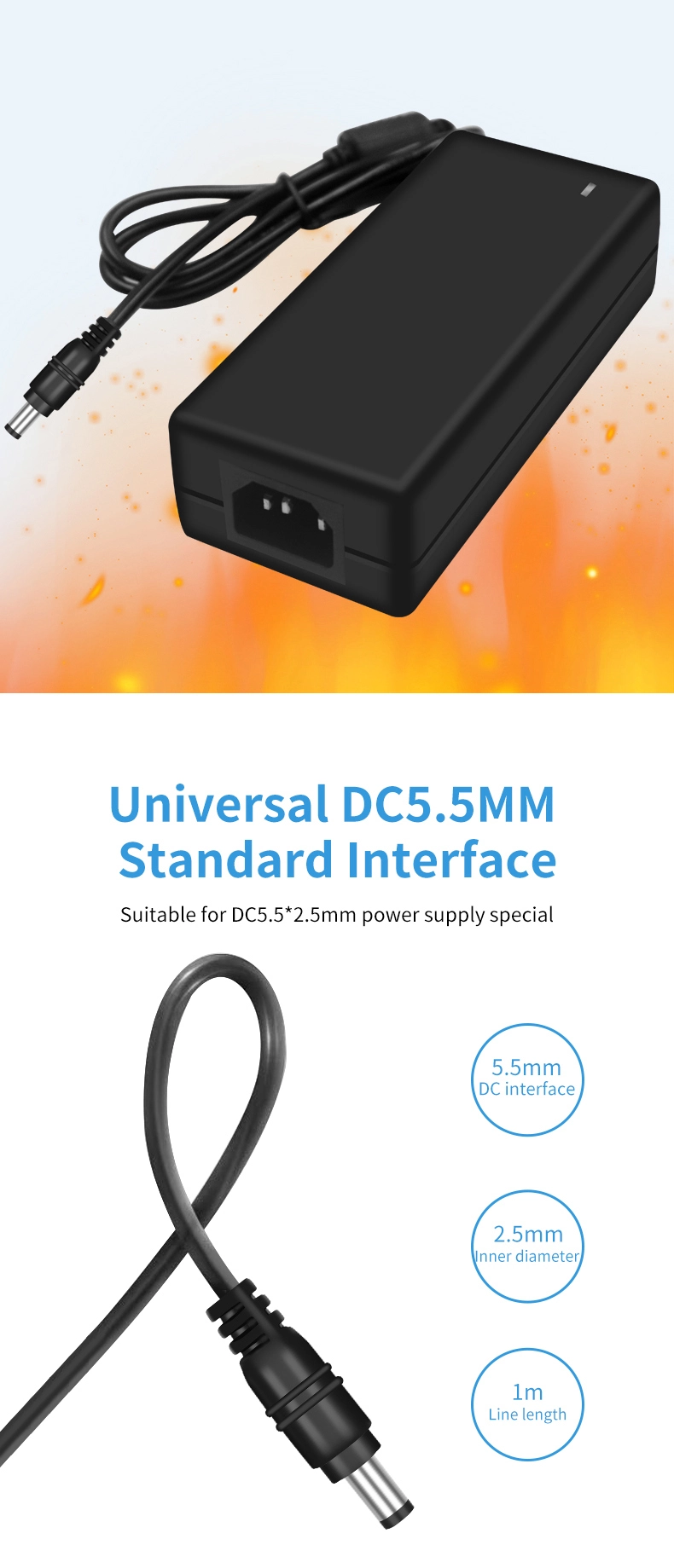 Vstup širokého napätia AC 100-240 V je kompatibilný s rozvodnými sieťami vo viac ako 100 krajinách sveta. 1,5 m predĺžený výstupný kábel (priemer 1,0 mm²) spárovaný s DC konektorom otočným o 180° sa prispôsobí rôznym scenárom inštalácie. S kompaktnou veľkosťou iba 120 × 60 × 30 mm je o 35 % menší ako tradičné adaptéry s rovnakým výkonom, váži len 280 g – zlepšuje prenosnosť o 50 %.