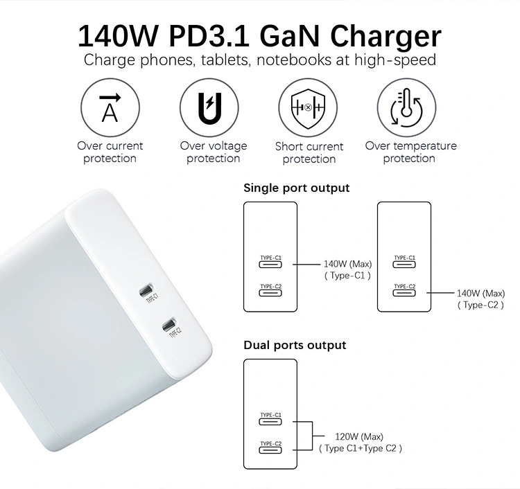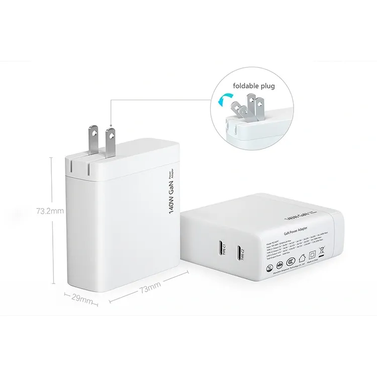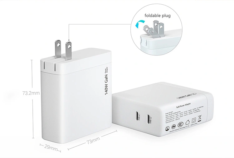140W duálny usb c port PD Charger Skladacia US zástrčka: Jediný port môže poskytnúť až 140W napájanie. Výstupný výkon dvoch portov je inteligentne prideľovaný súčasne. Pri súčasnom nabíjaní notebooku a mobilného telefónu zostáva efektivita nezmenená.