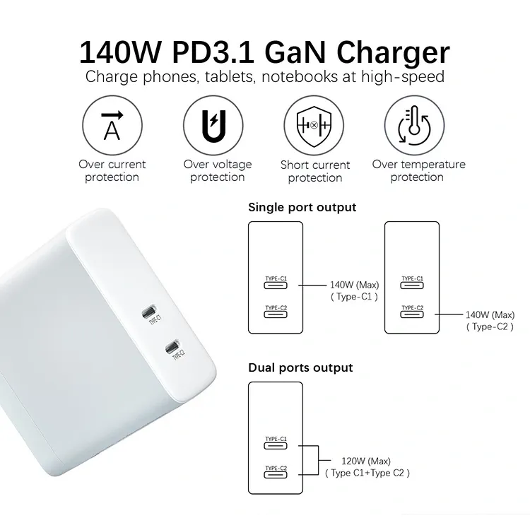 GAN: Vďaka čipom GaN je veľkosť 140W PD Charger znížená o 50 % v porovnaní s tradičnými nabíjačkami, čo uľahčuje prenášanie na služobné cesty alebo kancelárske použitie bez toho, aby zaberalo miesto v zásuvke.