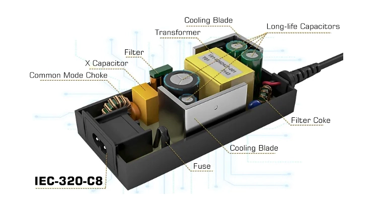 Napájací adaptér STARWELL vyhovuje medzinárodným bezpečnostným normám (CE a FCC) a má štyri vrstvy ochrany: prepätie (automaticky sa vypne, keď napätie prekročí menovité napätie o ±15 %), nadprúd (prúdový limit 12 A), skrat (rýchle vypnutie do 10 milisekúnd) a prehriatie (inteligentné zníženie záťaže, keď teplota dosiahne 85 °C). Jeho rýchlosť odozvy na poruchu je o 30 % rýchlejšia, než je priemer v odvetví.