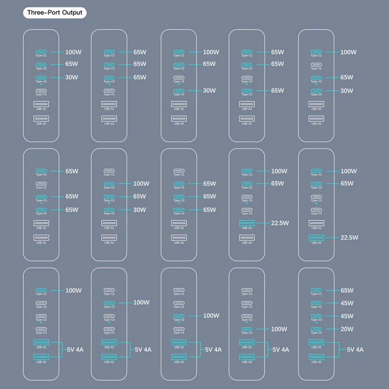 Výstup USB C1/C2/C3/C4: 5V/3A 9V/3A 12V/3A 15V/3A 20V/5A (100W Max) USB A1/A2: 5V/3A 9V/2A 12V/1,5A (18W Max) |
