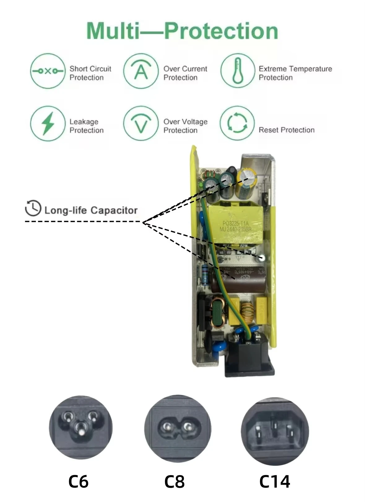 Komplexná bezpečnostná ochrana: Integrované ochranné prvky vrátane ochrany proti nadmernému prúdu (OCP), ochrany proti prepätiu (OVP) a ochrany proti skratu (SCP) zabraňujú poškodeniu adaptéra aj vášho cenného vybavenia.