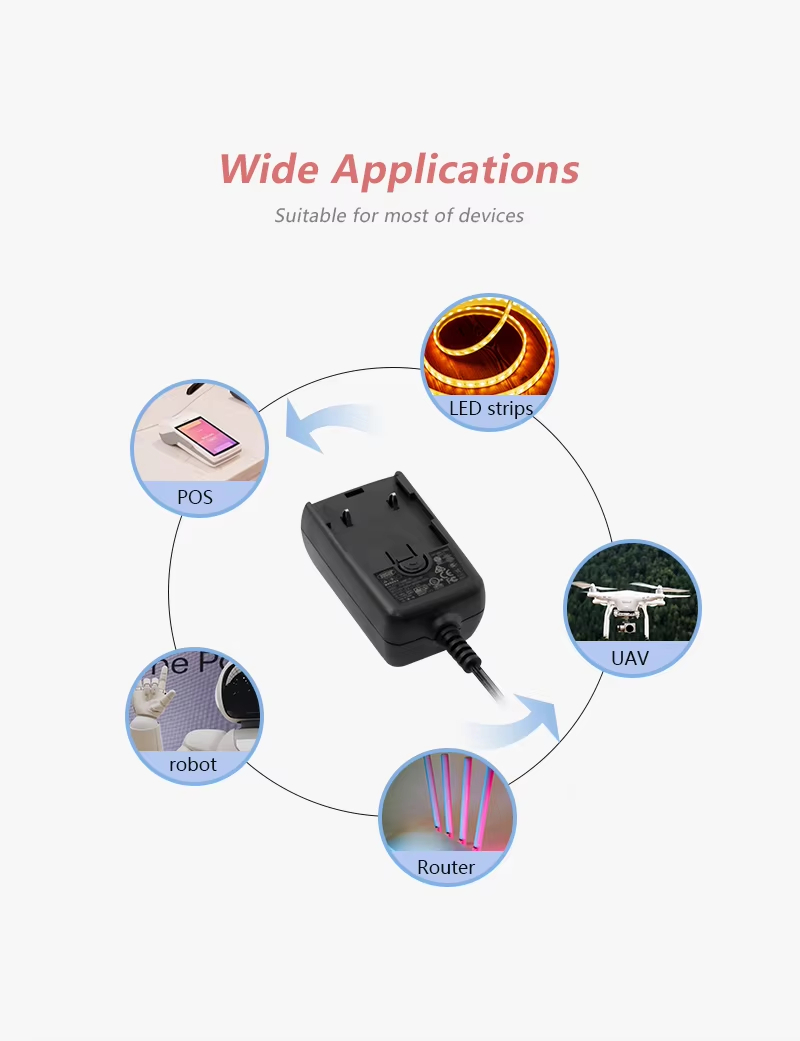 Široká škála aplikačných scenárov: Či už ide o napájanie svetelných pásov LED, inteligentných reproduktorov, sieťových smerovačov alebo iných malých elektrických spotrebičov, tento výkonný prepínací napájací zdroj s vymeniteľnou zástrčkou je vašou najideálnejšou a najbezpečnejšou voľbou!