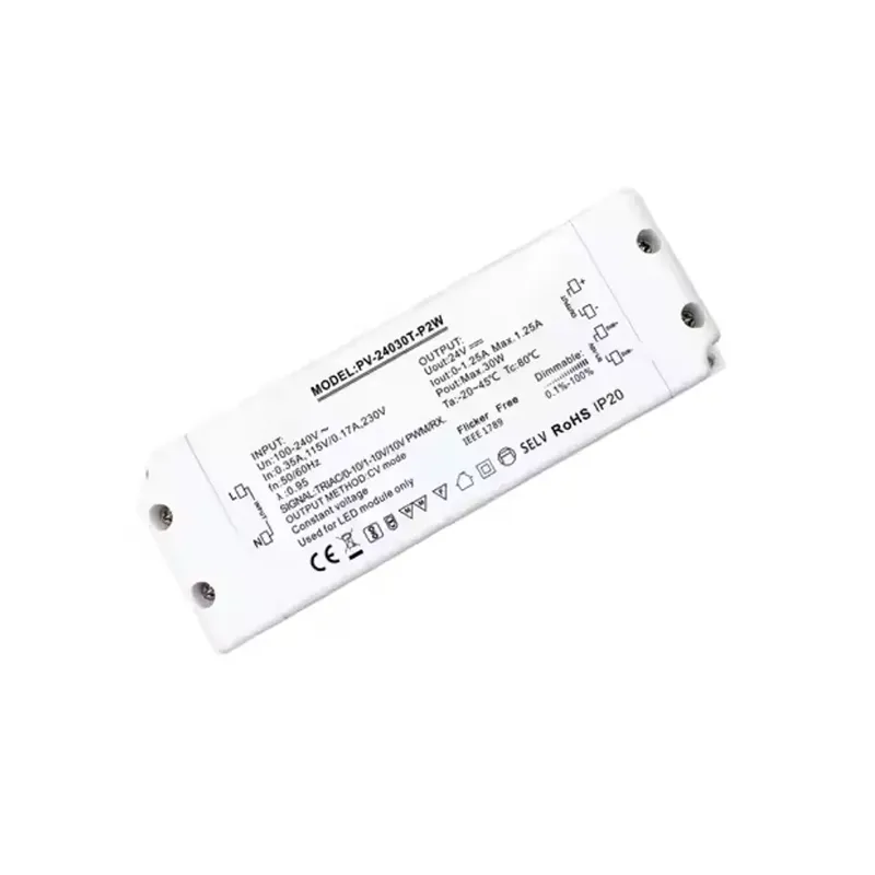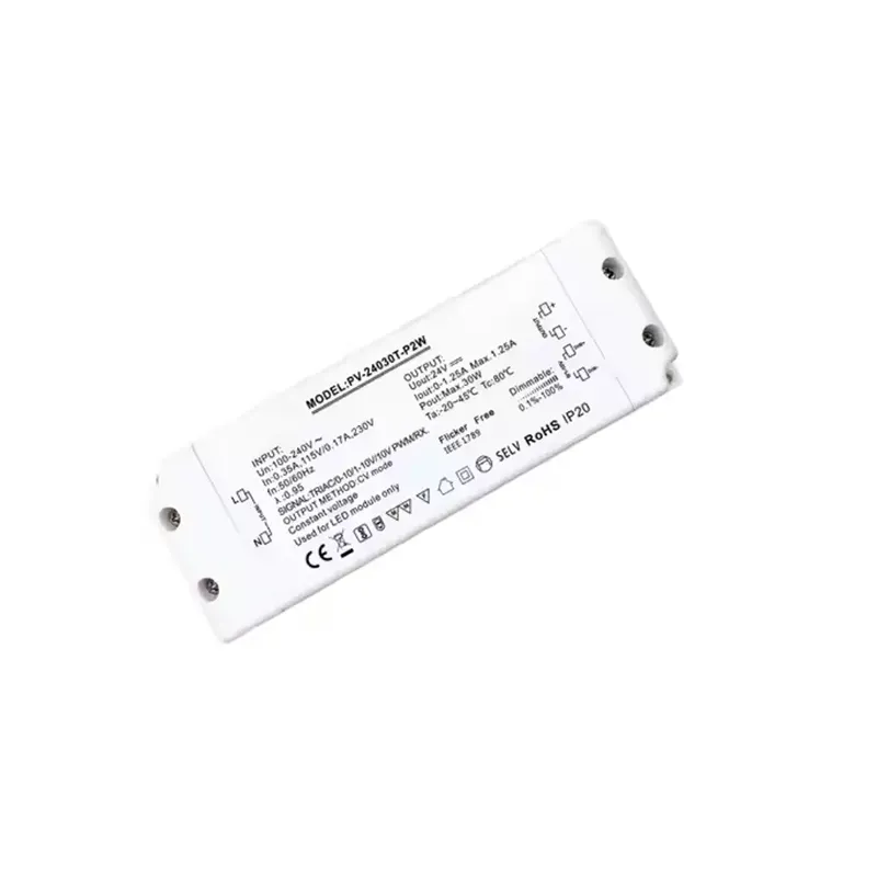 TRIAC 0-10V stmievateľný 30W zdroj konštantného napätia, Starwell ponúka 5-ročnú záruku na dlhodobé zabezpečenie kvality. Všetky jeho hlavné komponenty sú vyrobené podľa priemyselných štandardov, vyznačujú sa vynikajúcou odolnosťou proti prepätiu, odolnosťou voči vysokým teplotám a dlhodobou prevádzkovou spoľahlivosťou. Tento 30W stmievací LED driver s konštantným napätím TRIAC, ktorý integruje stmievanie v dvoch režimoch, výstup konštantného napätia, technológiu bez blikania a dlhú životnosť, je vynikajúcou voľbou pre tých, ktorí hľadajú vysokokvalitné svetelné efekty. Vitajte na dotaze.