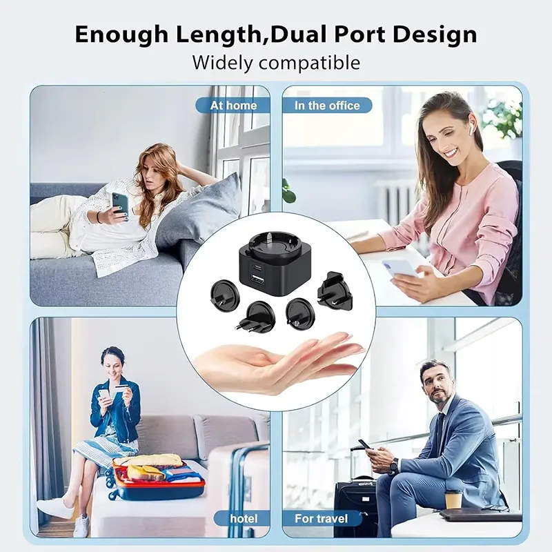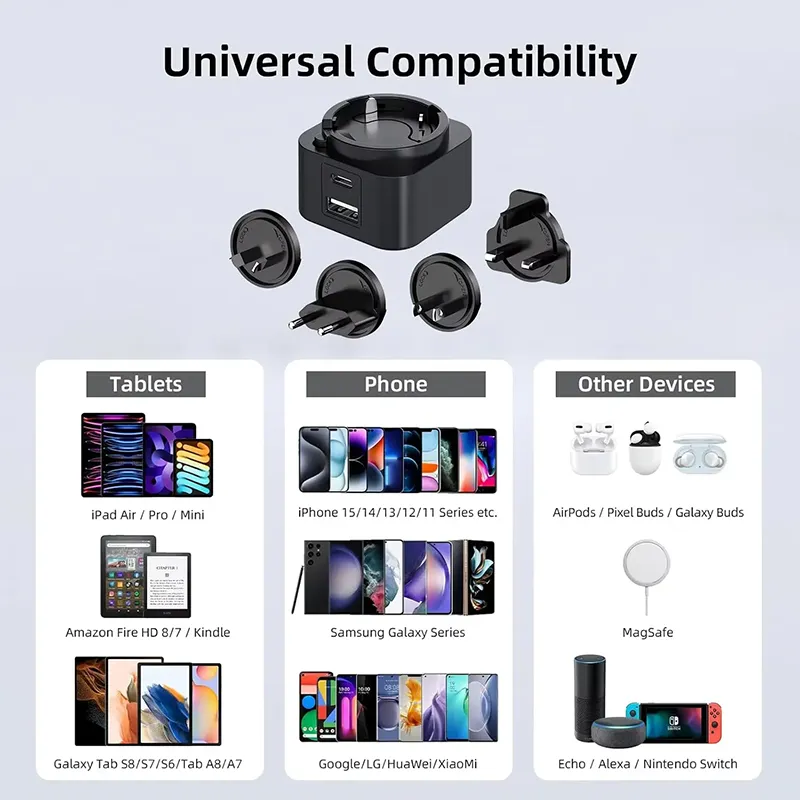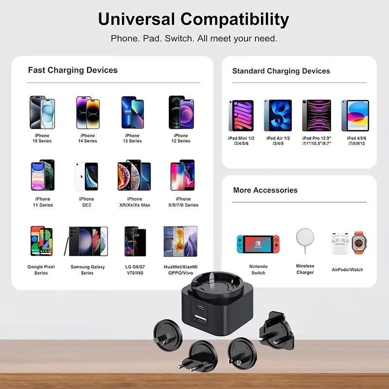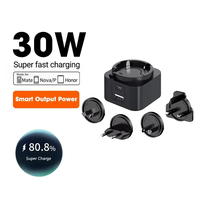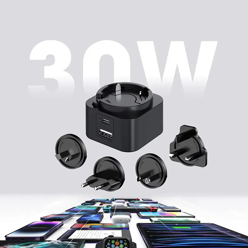 Všestrannosť je kľúčová. Dizajn s dvoma portami (USB-C/USB-A) umožňuje nabíjať dve zariadenia súčasne. Nabíjačka PD s vymeniteľnou zástrčkou 30 W obsahuje sadu vymeniteľných zástrčiek (US/EU/UK/AU), vďaka čomu je vaším dokonalým spoločníkom na cesty po celom svete. Či už nabíjate smartfón, tablet alebo notebook, univerzálna kompatibilita zaisťuje špičkový výkon.