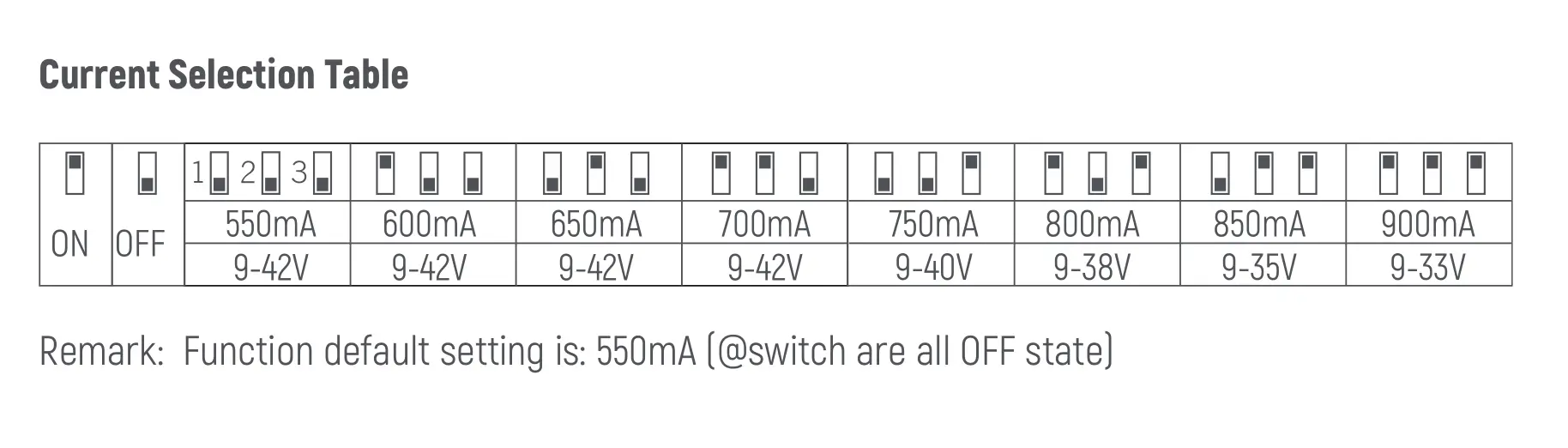 Výstupný prúd: nastaviteľný, podrobnosti nájdete v tabuľke výberu prúdu