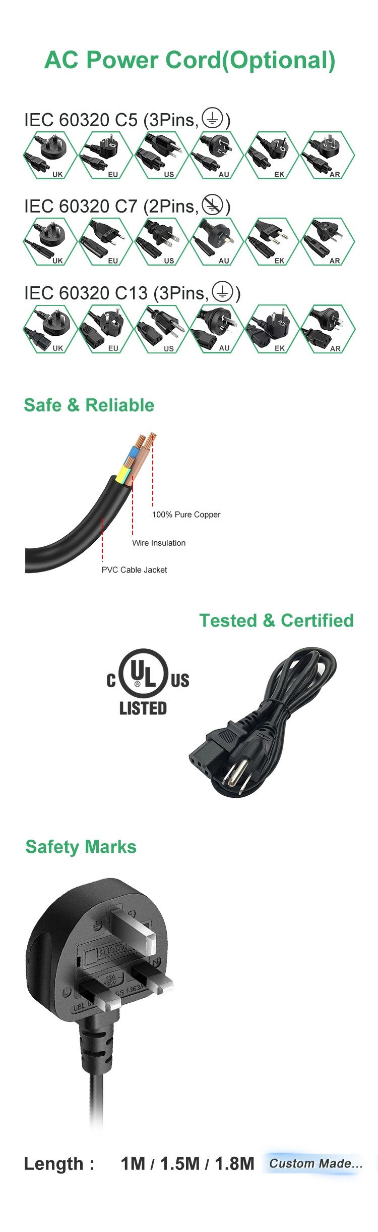 * Ďalšie jednotky pre sériu 200 W: 5V/8V/9V/12V/13,5V/15V/18V/19V/24V/25V/30V/36V/29V/30V/42V/48V k dispozícii * Bezpečnosť: OCP/OVP/OTP, SCP, automatické odpojenie pri preťažení, odpojenie pri prepätí, automatické tepelné odpojenie. * Široká kompatibilita: LED pásové svetlá, 3D tlačiareň, rádioamatér, CCTV kamery, subwoofer do auta, audio zosilňovač, bezdrôtový router, ADSL Cats, zvlhčovač, HUB, klávesnica, BT reproduktor, monitor, webkamera, DVR, NVR, audio/video napájanie