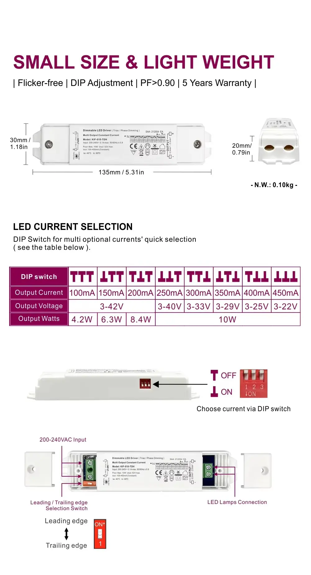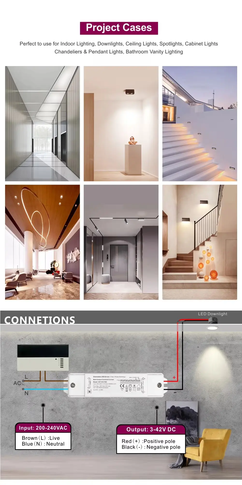 Stabilný a ochranný konštantný prúd: Udržiava presný a stabilný výstup prúdu do vašich LED modulov, čím zabezpečuje konzistentný jas, jednotnosť farieb a predĺženú životnosť LED tým, že chráni pred kolísaním prúdu a prepätím.
